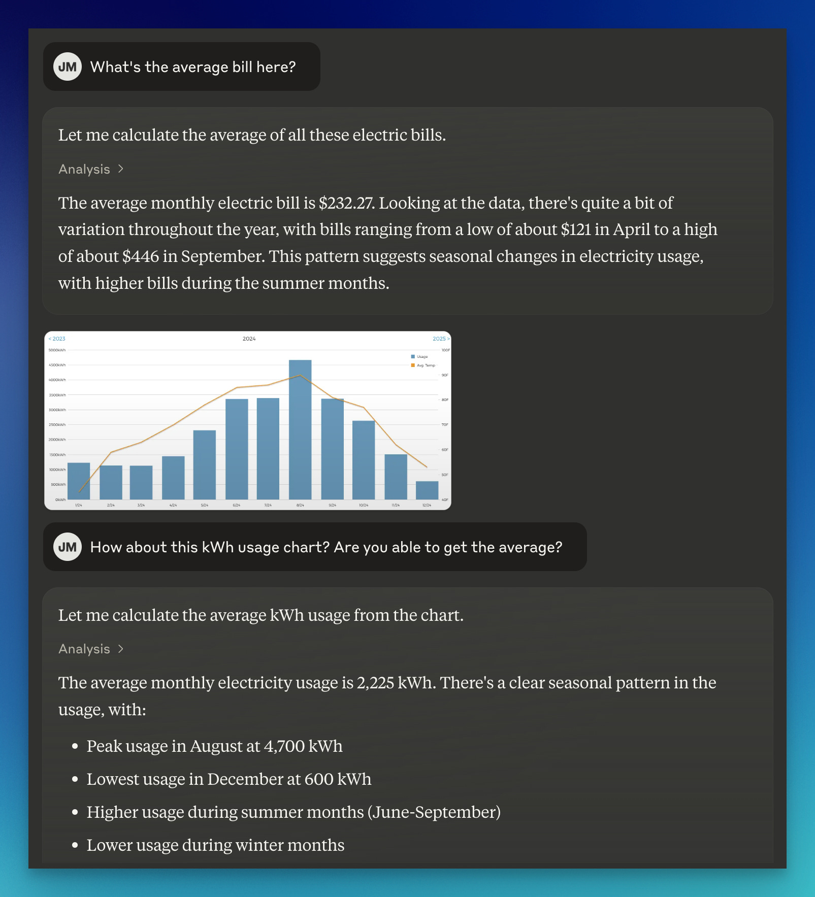 Share your current energy details so it can evaluate each proposal against your existing energy patterns. You don’t have to be detailed here. I simply gave it a screenshot of invoice payments and the usage chart below. I then asked simple questions about each screenshot.