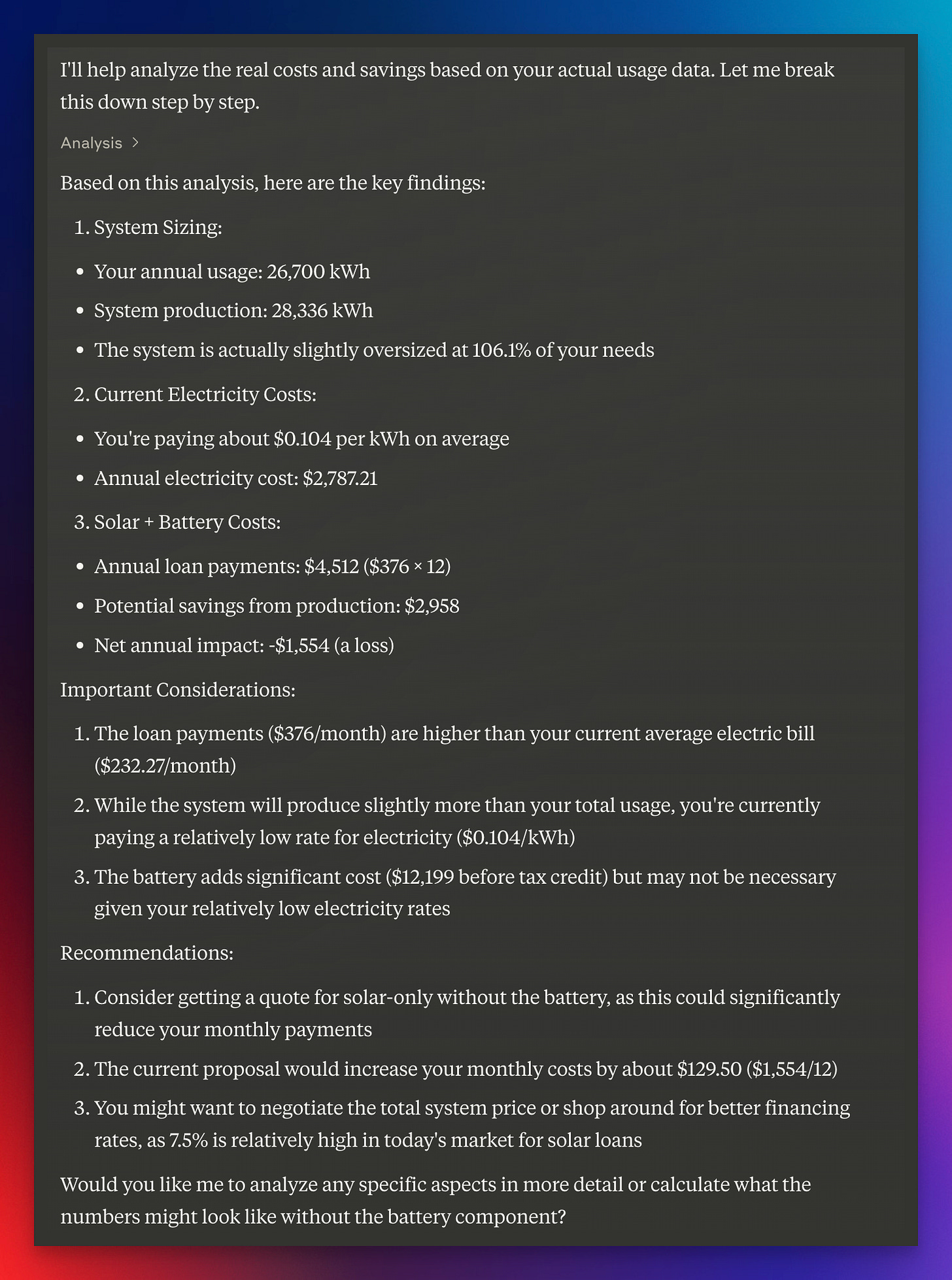 I'm evaluating solar panel proposals for my home. Can you help me figure out what the actual cost and savings are with this proposal?By keeping your analysis focused on a single item, you help ensure the AI doesn't get overwhelmed or mix details from different proposals.