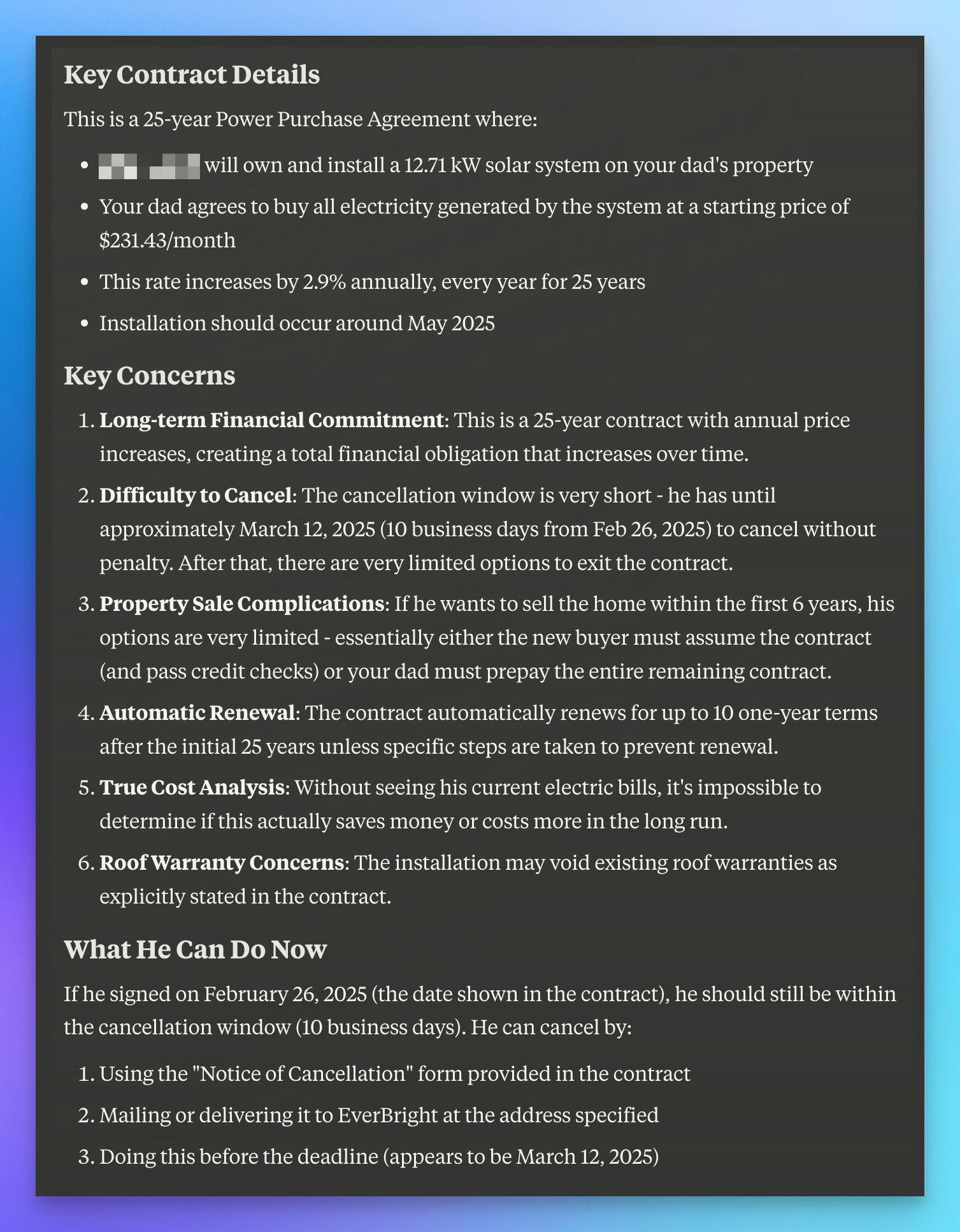 Contract Insight: In my father's case, we identified that his contract was a Power Purchase Agreement (PPA) rather than a loan, with an automatic 25-year renewal clause and other terms that weren't immediately obvious