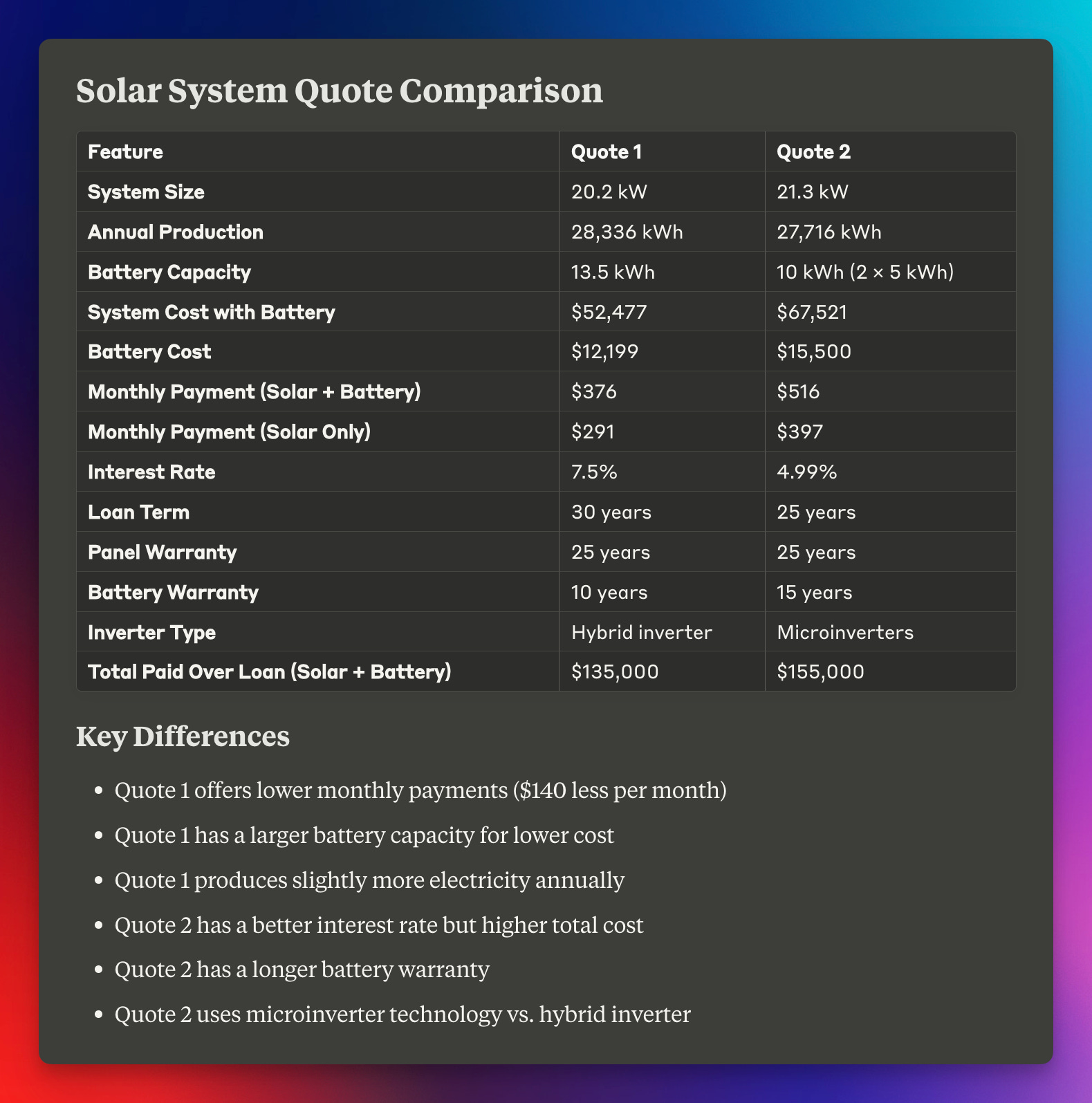 When evaluating solar panel options, you'll likely face a stack of competing proposals from services like Energy Sage, each filled with technical specifications, varying financial terms, and complex projections that make meaningful comparison challenging. In a real-world example, I recently used AI to evaluate multiple Energy Sage proposals, while also helping my father review a contract he had signed with a door-to-door salesman.
